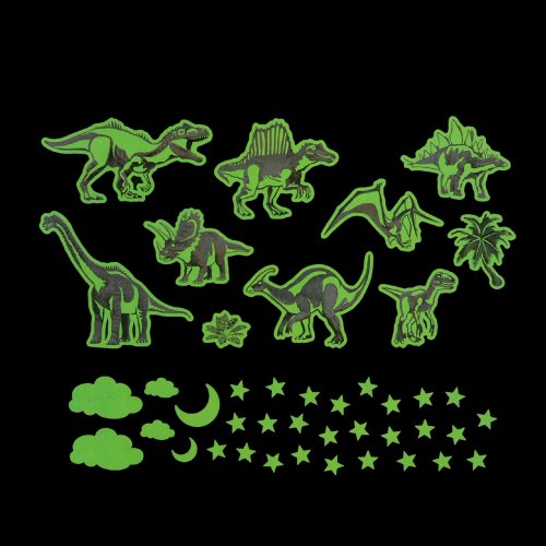 Dekorace dinosauří svět na stěnu, nebo na nábytek. Po zhasnutí svítí ve tmě. Stačí nalepit a usínání bude hračka!Dekorace na stěnu dinosauři svítící ve tmě.