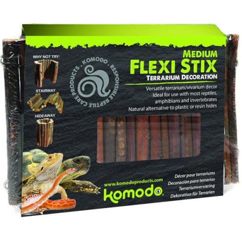 Variabilní přírodní dekorace vhodná pro většinu plazů, obojživelníků i bezobratlých. Dřevěné špalíčky navléknuté na ohebných drátech tvoří všestranně použitelný, snadno tvarovatelný prvek, z něhož lze vyrobit úkryt, most, přístupovou cestu nebo vyhřívací plošinu. Flexi Stix lze použít i v ubikacích drobných savců. Rozměry: cca 27 × 17 × 2 cm Materiál: dřevo, kovový drát Upozornění: Výrobek pravidelně kontrolujte a poškozený nebo příliš rozpraskaný dále nepoužívejte. Tvar, vzhled a rozměry jsou u každého výrobku mírně odlišné.