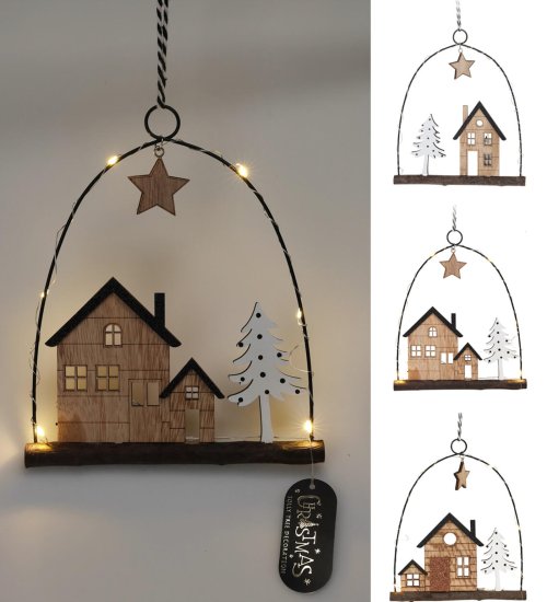 Dekorace závěsná DOMEČEK 6LED, 20,5 cm, kov / dřevo. rozměry: 20,5 x 1,5 x 18 cm materiál: dřevo, kov barva: přírodní / černá mix dekorů - 3 varianty baterie 2 x CR2032, jsou součástí Závěsný dřevěný …