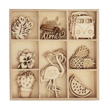 dřevěné dekorace (téma tropic / dovolená) motivy: 7 různých motivů + nápis "Good times" vhodné k dekoraci, papírovému či jinému tvoření balení obsahuje celkem 40 ks dekorací různé rozměry - např. plameňák …