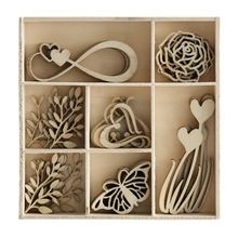 dřevěné dekorace se symboly lásky motivy: 7 různých motivů - srdce, nekonečná láska, tráva se srdíčky, větvičky, motýl, růže vhodné k dekoraci, papírovému či jinému tvoření balení obsahuje 35 ks dekorací …