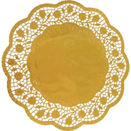 Dekorativní krajka kulatá, zlatá. Průměr 36 cm, balení 4 ks.