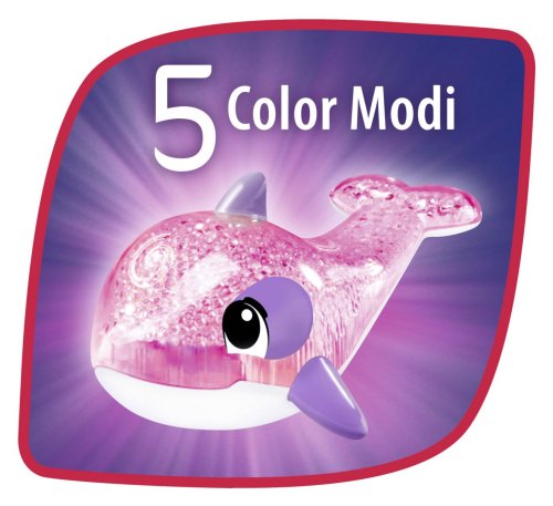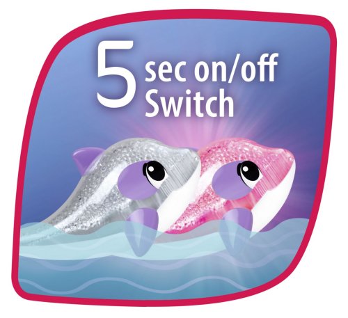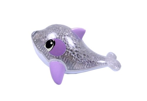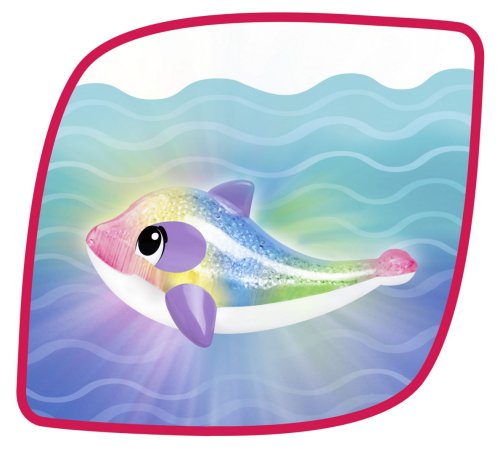 Třpytivý delfín je skvělý pro malé děti. Jeho fialové tělo je pokryto třpytivou stříbrnou vrstvou. Pod ocasní ploutví je senzor, díky kterému se delfín při dotyku rozzáří duhovými barvami. Delfín je vhodný také do vany, kde plave na hladině a svítí pod vodou. Délka 14 cm.