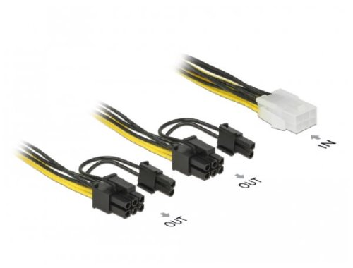 Delock napájecí kabel může být použit pro napájení PCI Express karet, které vyžadují vysokou spotřebu energie a mají dva 8 pin nebo 6 pin napájecí konektor např. grafické karty. Na obou 8 pin portech samce můžete odstranit dva piny, takže můžete získat 6 pin rozhraní PCIe.