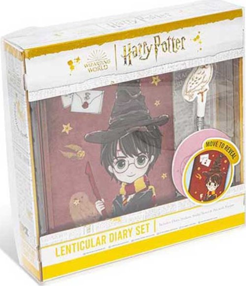 Deník sada Harry Potter Lenticular – vítejte ve fascinujícím kouzelnickém světě s Deníkem Harryho Pottera! Tento deník vás přenese do kouzelného světa Bradavic a umožní vám znovu prožívat oblíbené okamžiky. Sada obsahuje – deník, pero s topperem, samolepící bloček a sadu samolepek.