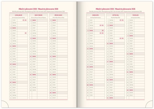Nová řada diářů v moderním designu doplněném o pevnou gumičku a poutko na pero. Denní rozložení s česko-slovenským kalendáriem a doplňkovou angličtinou, němčinou, maďarštinou a ruštinou.