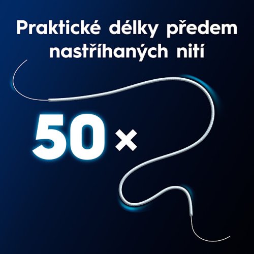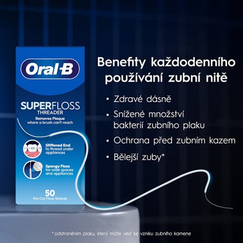 Udržujte své zuby a ústní dutinu čisté i kolem rovnátek a můstků pomocí zavaděčů zubních nití Oral-B Superfloss. Vyztužené konce vláken se snadno zavádí pod ortodontické aparáty, zatímco porézní nit čistí široké meziprostory, abyste se dostali i do těžko přístupných míst a odstranili více plaku* a zubního kamene než při samotném čištění zubů. Každodenní používání mezizubní nitě Oral-B pomáhá předcházet vzniku zubního kazu, nánosům zubního kamene a s dentální hygienou, a dokonce udržuje bělost zubů tím, že pomáhá zabraňovat vzniku povrchových skvrn odstraňováním plaku způsobujícího vytváření zubního kamene. Obsahuje 50 předem nastříhaných kusů zubní nitě. *při používání dentální nitě a kartáčku v porovnání s čištěním zubů pouze kartáčkem