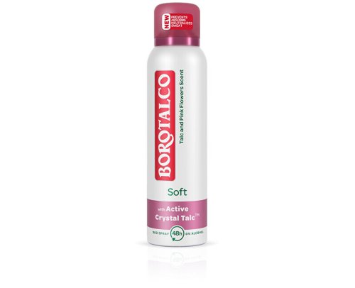 Deodorant ve spreji Soft od značky Borotalco díky účinnému složení vstřebává pot a zanechává pokožku podpaží suchou a chráněnou po celých 48 hodin. Pro dlouhotrvající svěží pocit.