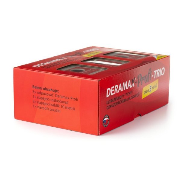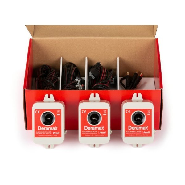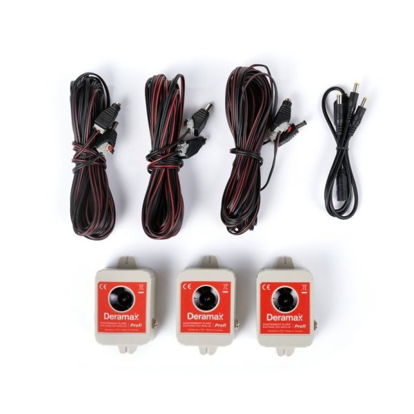 Sada Deramax-Profi-Trio se skládá ze 3 ks plašičů Deramax-Profi, které se připojují k centrálnímu napájecímu rozbočovači pomocí 10 metrů dlouhých prodlužovacích kablíků. Rozbočovač slučuje všechny prodlužovací kablíky a připojuje je k centrálnímu napájecími zdroji (zdroj není součástí dodávky).