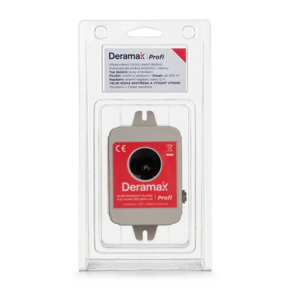 Ultrazvukový plašič (odpuzovač) Deramax-Profi je elektronické zařízení, které slouží k ochraně vnitřních nebo venkovních prostor před kunami, hlodavci a rejsky. Přístroj je zcela bezpečný a bezhlučný jak pro člověka, tak i pro běžná domácí a hospodářská zvířata a umožňuje tak bezproblémové využití i v obytných prostorách. Škůdci jsou trvale obtěžováni ultrazvukovými signály plašiče a v krátkém čase opouští chráněný prostor. Nedochází tedy k úhynu škůdců a nevzniká nutnost odstraňovat uhynulá zvířata. Provoz přístroje je zcela ekologický, bez využití chemických prostředků.