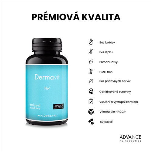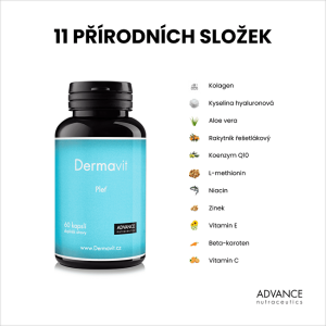 Přípravek Dermavit obsahuje přírodní látky kolagen, kyselinu hyaluronovou, koenzym Q10, methionin, aloe veru, rakytník a další, které podporují maximální synergický efekt.