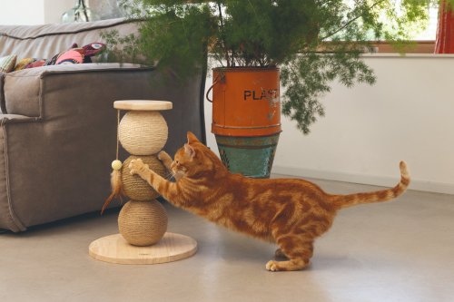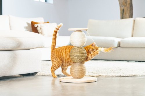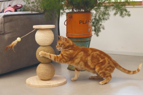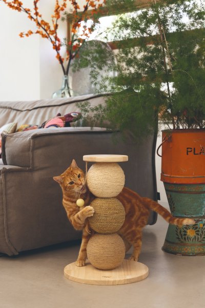 Škrabadlo Elio je skutečným designovým kouskem pro Váš domov, se kterým si Vaše kočka užije spoustu radosti ze škrábání! Je vyrobeno z kaučukového dřeva, které má krásnou, světle krémovou barvu. Každá koule je navíc omotána jiným typem provazu: jutou, sisalem a mořskou trávou. Součástí škrabadla je hračka s hracím peřím pro extra zábavu! Škrabadlem Elio uděláte radost nejen Vaší kočce, ale také bude vypadat fantasticky ve Vašem interiéru!