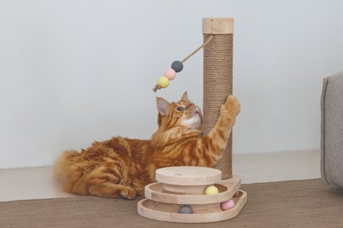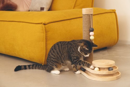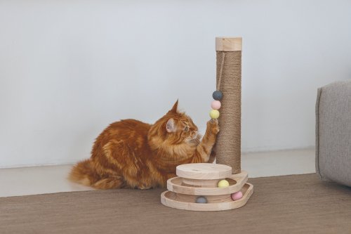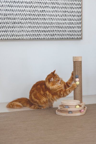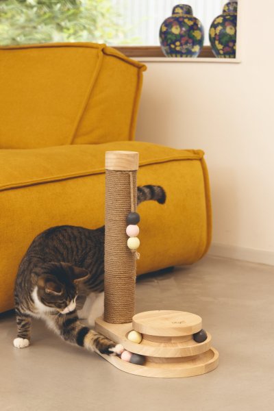 Představujeme multifunkční škrabadlo Inez od Designed by Lotte. Kromě standardního škrabacího sloupku se pyšní také zábavnou hrací věží vybavenou míčky. Jakmile se Vaše kočka dotkne tlapkou nebo čumáčkem míčků, začnou se ve věži kutálet do všech stran. Škrabadlo Inez je vyrobeno z kaučukového dřeva, škrabací sloupek je omotán jutovým lanem. Součástí sloupku je zavěšená hračka. Vaše kočka si tak může pohodlně brousit drápky, pečovat o ně a hrát si do sytosti.