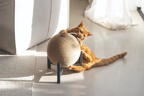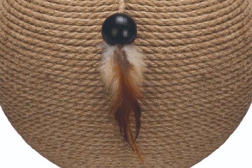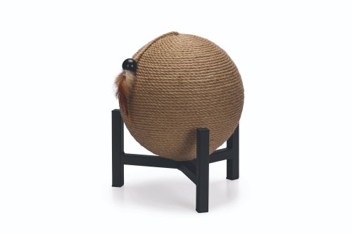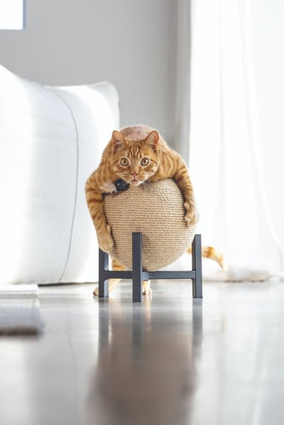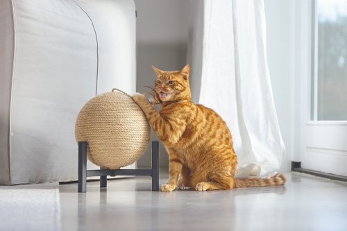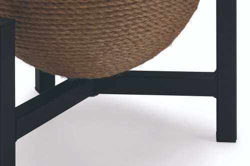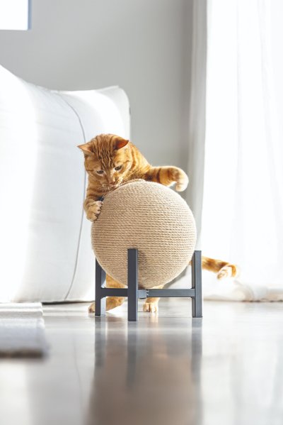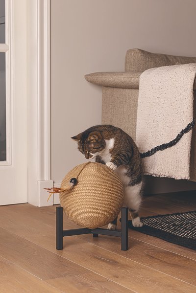 Škrabadlo Tyra od Designed by Lotte upoutá každého na první pohled. Koule, omotaná jutovým lanem, je zasazena do kovové základny. Perfektně se hodí například k industriálnímu stylu bydlení. Samozřejmostí jsou gumové krytky, umístěné na spodní straně kovového rámu, které zabraňují klouzání a poškrábání podlahy. Vaše kočka bude ráda zarývat drápky do jutového lana. Zavěšený míček s efektním peřím dělá ze škrabadla i lákavou hračku.