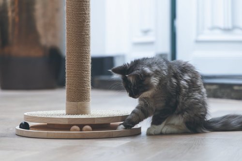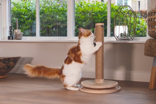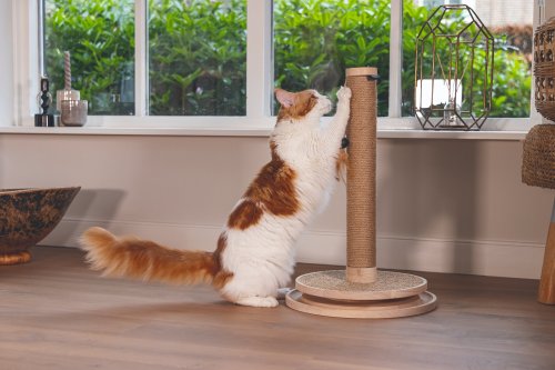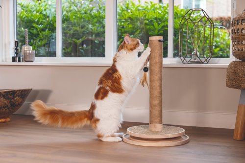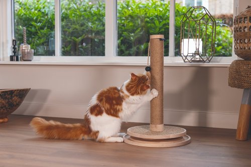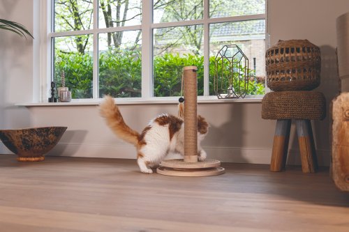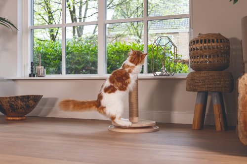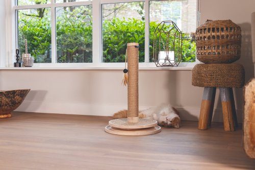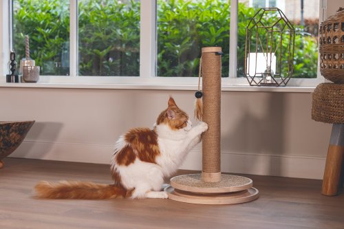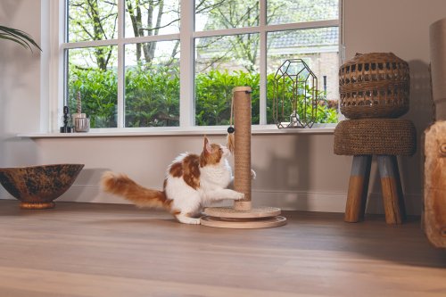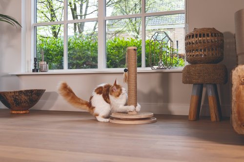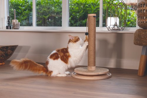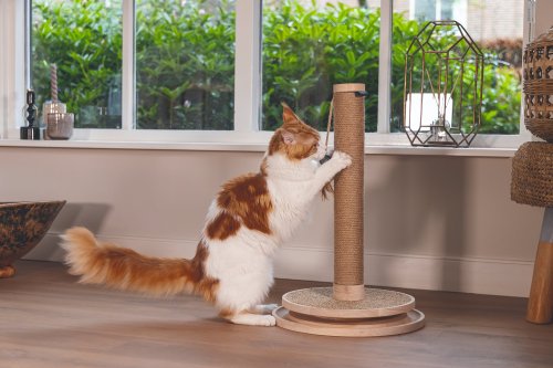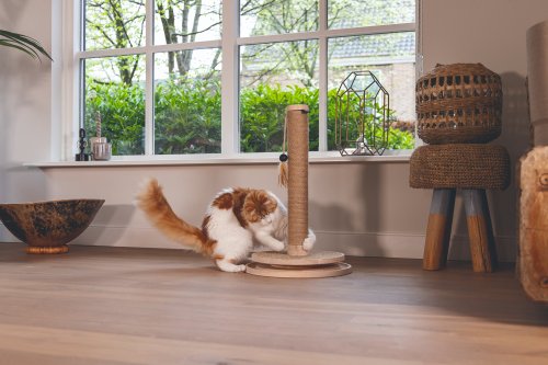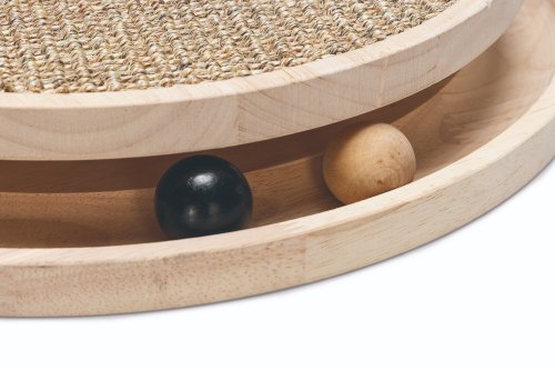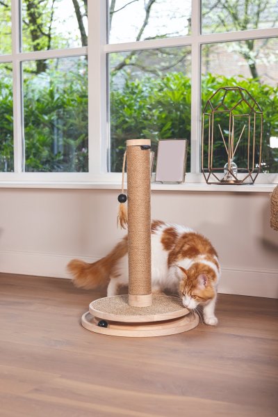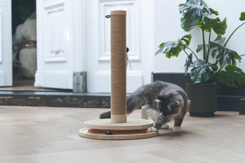 Škrabadlo Zavi od Designed by Lotte přispívá nejen k péči o drápky Vaší kočky, ale zároveň je skvělé i na hraní. V základně škrabadla se nachází zábavná koulodráha se 3 zabudovanými hracími míčky. Jakmile se Váš mazlíček dotkne kuliček, rozpohybují se. Ke škrabacímu sloupku je navíc připevněno lanko s peříčkem a míčkem. Aby se Vaše kočka mohla náležitě postarat o své drápky, je škrabadlo vybaveno jutovým lanem. Základna škrabadla je potažena sisalovou škrabací podložku. Kombinace těchto škrabacích prvků zajistí možnost škrábat horizontálně i vertikálně. Samotné škrabadlo je vyrobeno z kaučukového dřeva, které mu dodává krásný, přirozený vzhled.