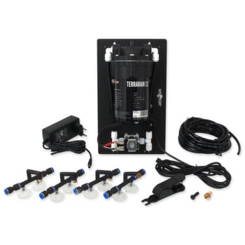 Obsah balení: rosící systém Terrarain2.0, nastavitelné trysky spřísavkami 4ks, spojovací díl 8ks, ukončovací díl (záslepka), hadice 5m, kovové sítko, síťový adaptér, řezací nůž, (pozor – nádoba na vodu není součástí, lze použít libovoulnou nádrž).