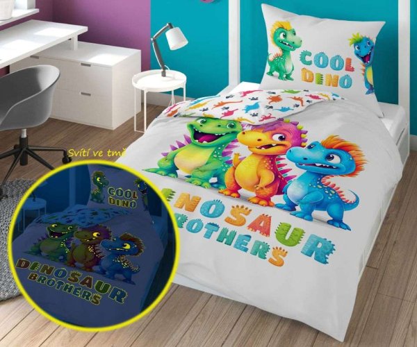 DETEXPOL Povlečení Dinosaur Brothers svítící 140/200, 70/80 Bavlněné povlečení na velkou postel, zapínání na zip, povlečení má z každé strany jiný motiv, viz. foto, povlečení svítí ve tmě po nasvícení na denním světle, svítící efekt se může začít vytrácet po 5 vypráních, možno prát na 40°C Materiál: 100% Bavlna Rozměr: 1x 140/200, 1x 70/80 cm