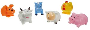 Gumová stříkací zvířátka farma obsahuje králíčka, oslíka, prasátko, kravičku, ovečku a kuřátko.Rozměr 7 cm.Vhodné od 12 měsíců.