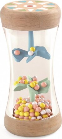 Dřevěné chrastítko bude děti fascinovat při podlehu na padající korálky, které mají uklidňující zvuk. plastový válec s korálky při otáčení vydáva zvuky podobné dešti barevné korálky a vrtulky vhodné …