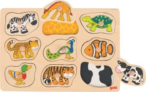 Barevná dětská vkládačka s devíti zvířátky s podkladovým obrázkem, který vypadá jako jejich kůže (srst).