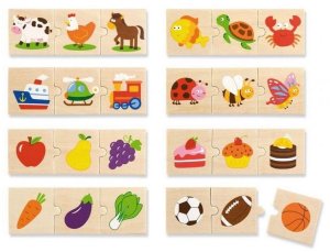 Dřevěné puzzle. Balení obsahuje 24 dřevěných puzzlí s motivy ovoce, zeleniny, zvířátek, jídla, hmyzu, sportu a dopravních prostředků.