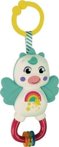 Barevné chrastítko v podobě malého jednorožce s měkkými a bezpečnými gumovými prvky. praktické poutko na zavěšení křidýlka slouží jako kousátko tři malé měkké kroužky stimuluje smyslové vnímání