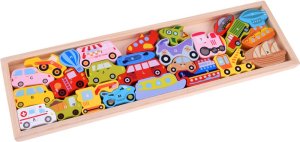 Barevná dětská vkládačka s motivem dopravních prostředků.