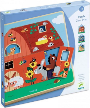 Třívrstvé dřevěné puzzle s 12 dílky, kde děti postupně odkrývají a skládají příběh zvířátek ze statku.