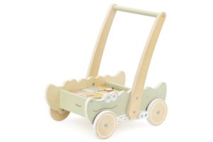 Dřevěný vozík o rozměrech cca 27,5 x 40 x 44 cm na kolech ,na kterém lze vozit řevěné kostky různých tvarů - jsou součástí balení.Rozměr balení cca 42 x 30 x 18 cm.Věk 12m+