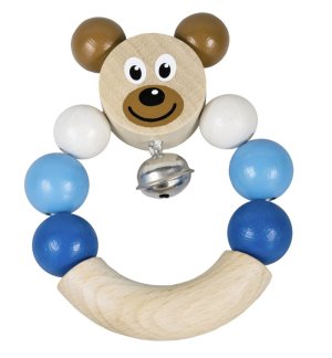 Dřevěné chrastítko s medvídkem v modré barvě.