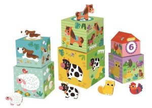 Těchto šest kostek s okýnkem slouží nejenom jako skládací věž, ale i jako domečky pro příslušná zvířátka - každý kamarád z farmy má tedy své bezpečné místečko.