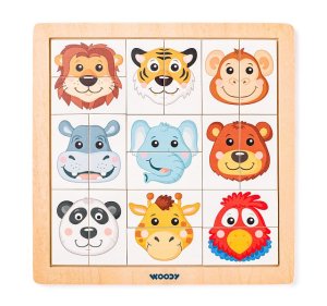 Roztomilé dřevěné puzzle s motivem zvířecích hlav 9 půlených skládaček roztomilé obrázky afrických zvířátek dřevěný rámeček český design od Hany Vavřinové Rozměr složeného puzzle cca 19 x 19 cm