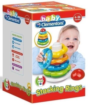 Vlastnosti a obsah sady Clementoni Barevná věž: 5 barevných kroužků různých velikostí, které lze sestavit do věže.