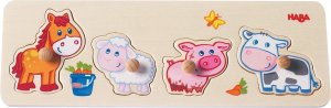 Dřevěná vkládačka s úchytkami od výrobce HABA. čtyři vkládací obrázky - koník, ovečka, kravička a prasátko úchytky jsou (stejně jako celý výrobek) z přírodního materiálu rozvíjí představivost, jemnou …
