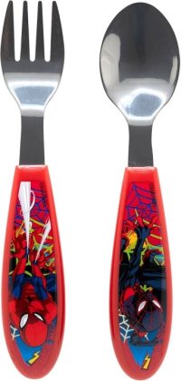 Sada 2 dětských příborů z nerezové oceli, obsahující vidlici a lžíci, s motivem Spidermana.