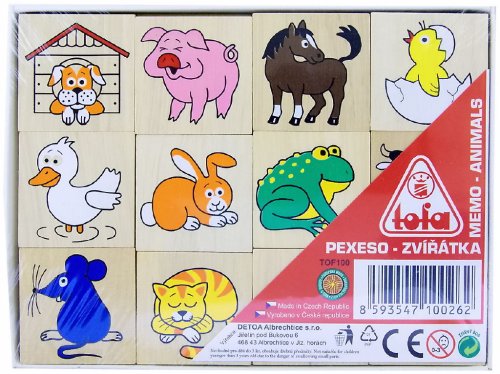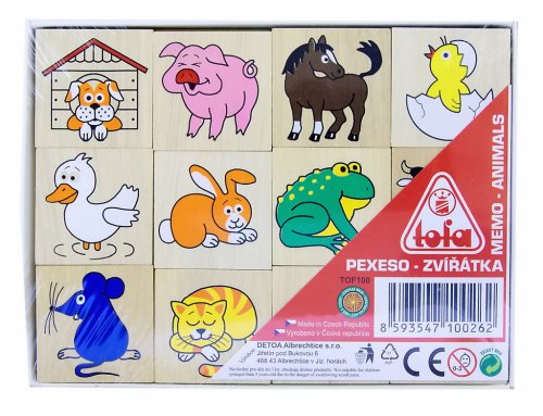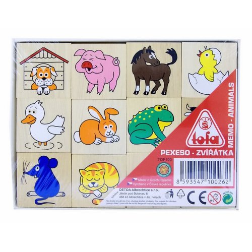Dřevěné pexeso s obrázky zvířátek pro procvičení soustředění a paměti. Hra obsahuje 24 kusů o velikosti 40 x 40 x 5 mm. Baleno v krabičce z tvrdého papíru. Nevhodné pro děti do 3 let. Obsahuje malé části. Výrobek je zdravotně nezávadný.