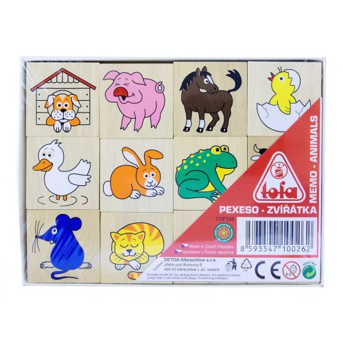 Pexeso z dřevěných kamenů o rozměrech 4x4x0,5 cm s potiskem zvířátek. Děti se zábavnou formou naučí poznávat zvířátka. Hlavní vlastnosti: Výrobek splňuje požadavkyEU na bezpečnost hračekVhodný pro děti od 3 letHra pomáhá při procvičení soustředění a paměti