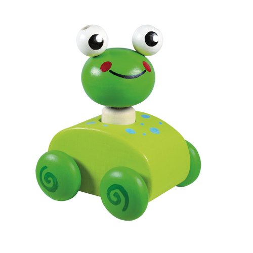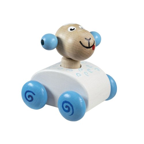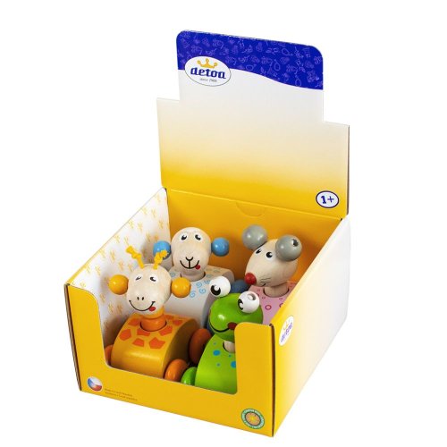 Dřevěná pískací zvířátka na kolečkách - série 4ks - žirafa, žabka, myška, ovečka. Při zmáčknutí zvířátka se ozve zapískání.
