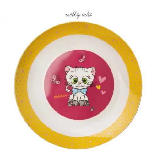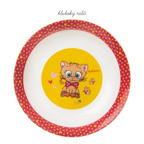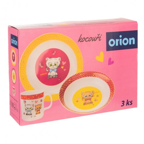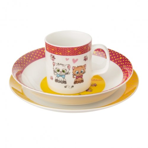Sada jídelní porcelánová s dekorem KOCOUŘI potěší vaše děti. Sada obsahuje hrneček, hluboký a mělký talířek. Materiál porcelán. Hrneček 225 ml, průměr 7 cm, výška 8 cm, talíř hluboký průměr 19 cm, výška 4 cm, talíř mělký průměr 21 cm, výška 2 cm. Nádobí lze mýt v myčce na nádobí. EAN 8592381174545