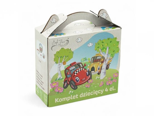 Sada jídelní porcelánová s dekorem AUTA potěší Vaše děti Sada obsahuje hrneček, misku, mělký talířek a kalíšek na vejce Dárkové balení Materiál porcelán Nádobí lze mýt v myčce na nádobí Rozměry: talíř průměr 18 cm, miska průměr 15 cm, hrnek objem 250 ml, kalíšek na vejce průměr 5 cm. EAN 5902738201665