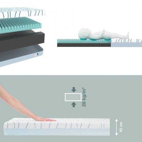 • výplň tvoří 2 typy pěny: vnější, bublinková s hustotou 28kg/m3 + vnitřní s hustotou 30kg/m3 - to zaručuje, že se miminko do matrace nezaboří