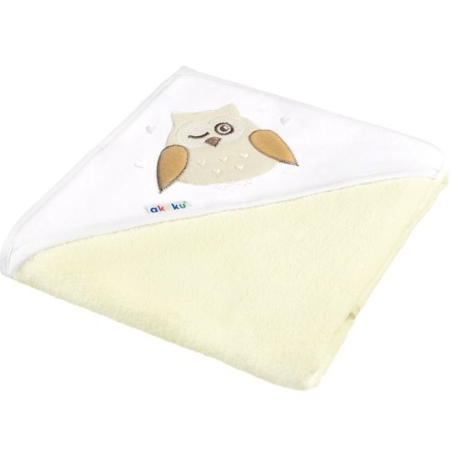 Dětská osuška Akuku s obrázkem a kapucí. Osuška je vyrobena z příjemného a měkkého materiálu. Vnitřní strana osušky je bavlněná, vnější fleecová. Rozměry: cca 100x100 cm. Složení: 100% bavlna.