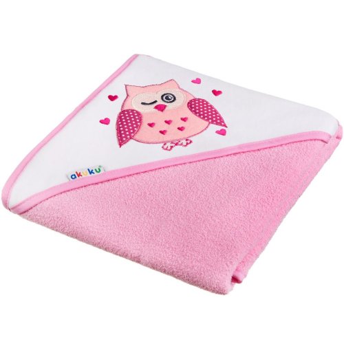 Dětská osuška Akuku s obrázkem a kapucí. Osuška je vyrobena z příjemného a měkkého materiálu. Vnitřní strana osušky je bavlněná, vnější fleecová. Rozměry: cca 100x100 cm. Složení: 100% bavlna.