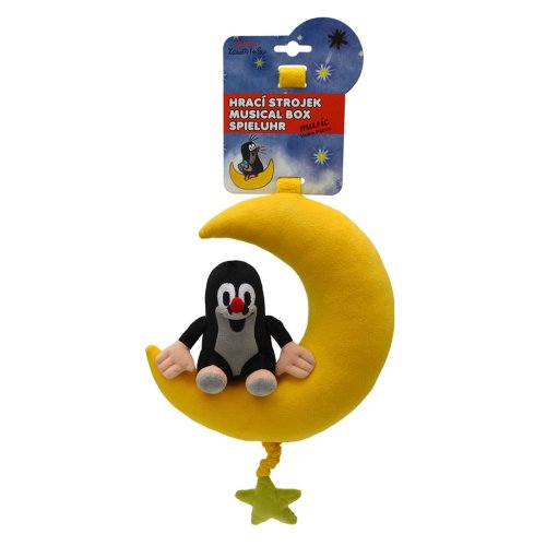 Plyšová hračka s mechanickým hracím strojkem. Zatáhněte za šňůrku a nechte letět Krtečka na měsíčku ke hvězdám při příjemné melodii. Autor hudby: prof. Vadim Petrov. Délka hry strojku je téměř 2 minuty. Snadné uchycení pomocí suchého zipu.