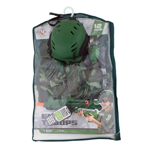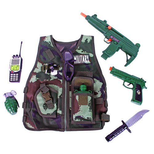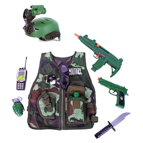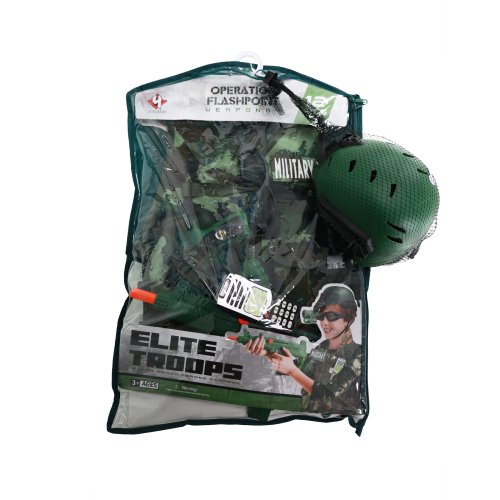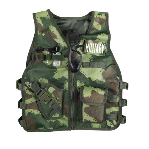 Vydej se na vojenskou misi s tímto parádním vybavením! Karnevalový kostým je určen pro chlapečky ve věkovém rozmezí 3-7 let (104-122 cm). Balení obsahuje vestu, přilbu se světlem (2 ks baterií typu LR44, které jsou součástí balení), granát, polní lahev, nůž, samopal, pistoli, brýle, vysílačku a další drobnosti.
