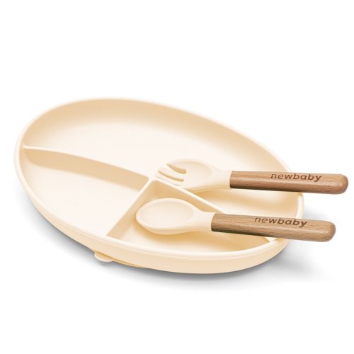- Lžičku a vidličku s dřevěnou rukojetí a jemným gravírováním loga New Baby (délka 14 cm) – příjemné na dotek a přizpůsobené malým ručičkám.
