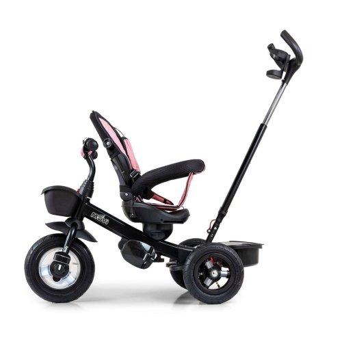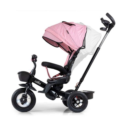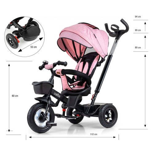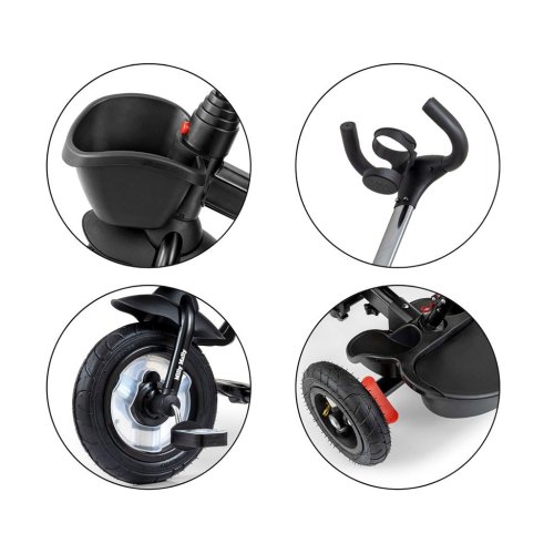 Je vyrobena z kvalitních a odolných materiálů. Má moderní konstrukci, pohodlné a ergonomicky tvarované sedadlo, které je otočné o 360 stupňů, což umožní dítěti cestovat ve směru nebo proti směru jízdy. O pohodlí a bezpečí během jízdy se stará bariérka, tříbodové bezpečnostní pásy, pohodlné stupačky nebo velká nafukovací kola, které skvěle absorbují rázy a poskytují dobrou přilnavost. Tříkolku může ovládat jak dítě, tak i rodič pomocí nastavitelné rukojeti pro tlačení. Po odebrání vodící tyče, sklápěcí stříšky, která chrání před sluncem nebo ostatních komponent bude sloužit jako tříkolka. Tříkolku lze používat rovněž jako alternativu golfového kočárku. Pro uložení hraček nebo potřeb pro dítě je zde praktický úložný košík.
