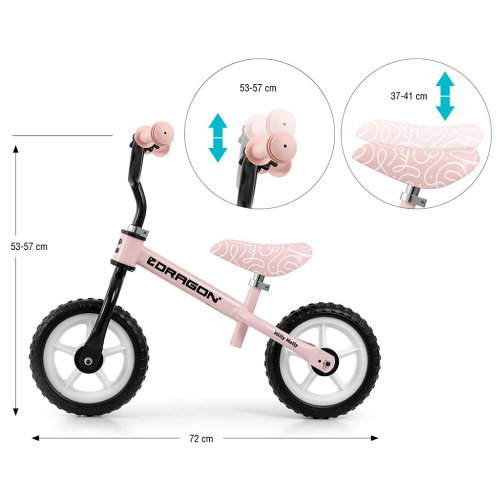 DRAGON poskytuje stabilitu, bezpečnost a pohodlí při jízdě doma i venku, například na zahradě. Lehká, ale odolná konstrukce zaručuje skvělou ovladatelnost za všech podmínek. Pěnová kola zajišťují plynulou jízdu a šetří nožičky malého cyklisty.