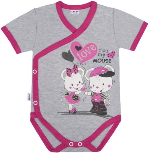 Bavlněné kojenecké body New Baby Love Mouse pro miminka. Dětské body je v krásné moderní barvě s barevným lemováním a je zdobeno obrázkem myšiček a nápisem Love for my Mouse. Praktické zapínání na cvočky na boční straně po celé délce a mezi nožičkami. Složení: 100% bavlna.