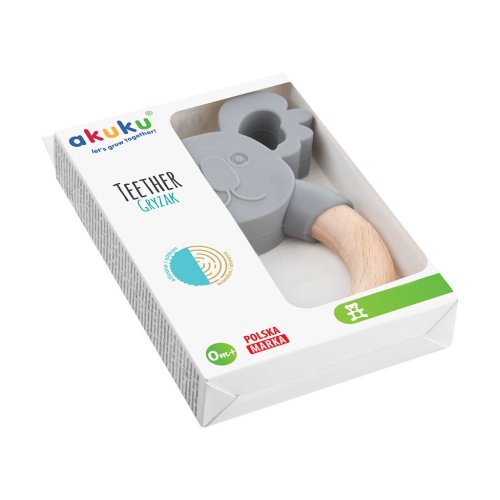 Kousátko je vyrobeno z bezpečného silikonu a dřeva. Jemně zklidňuje dásně dítěte při prořezávání zoubků. Speciální tvar umožňuje miminku snadné držení a zabraňuje jeho spolknutí.